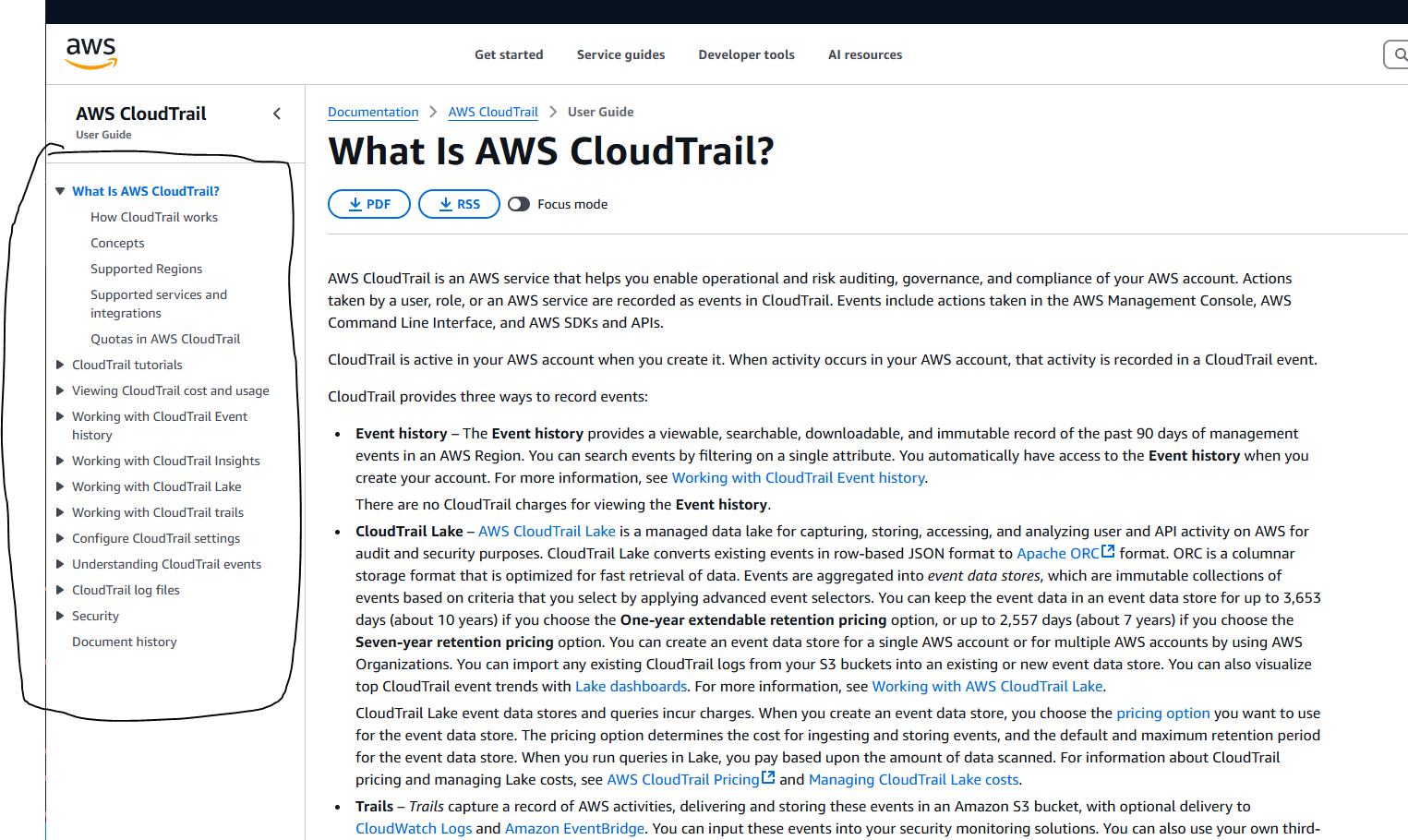 For example: Lets say I want to find out a little more about Cloud Trail, a simple google search will bring me to this page and I can navigate on the left to see all relevant topics related to CT. There are more complex security products like CloudWatch but I'll leave that up to you to learn. :)