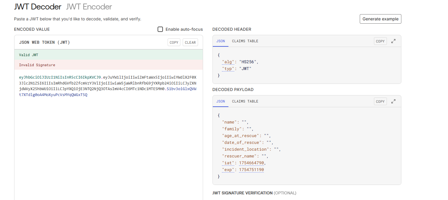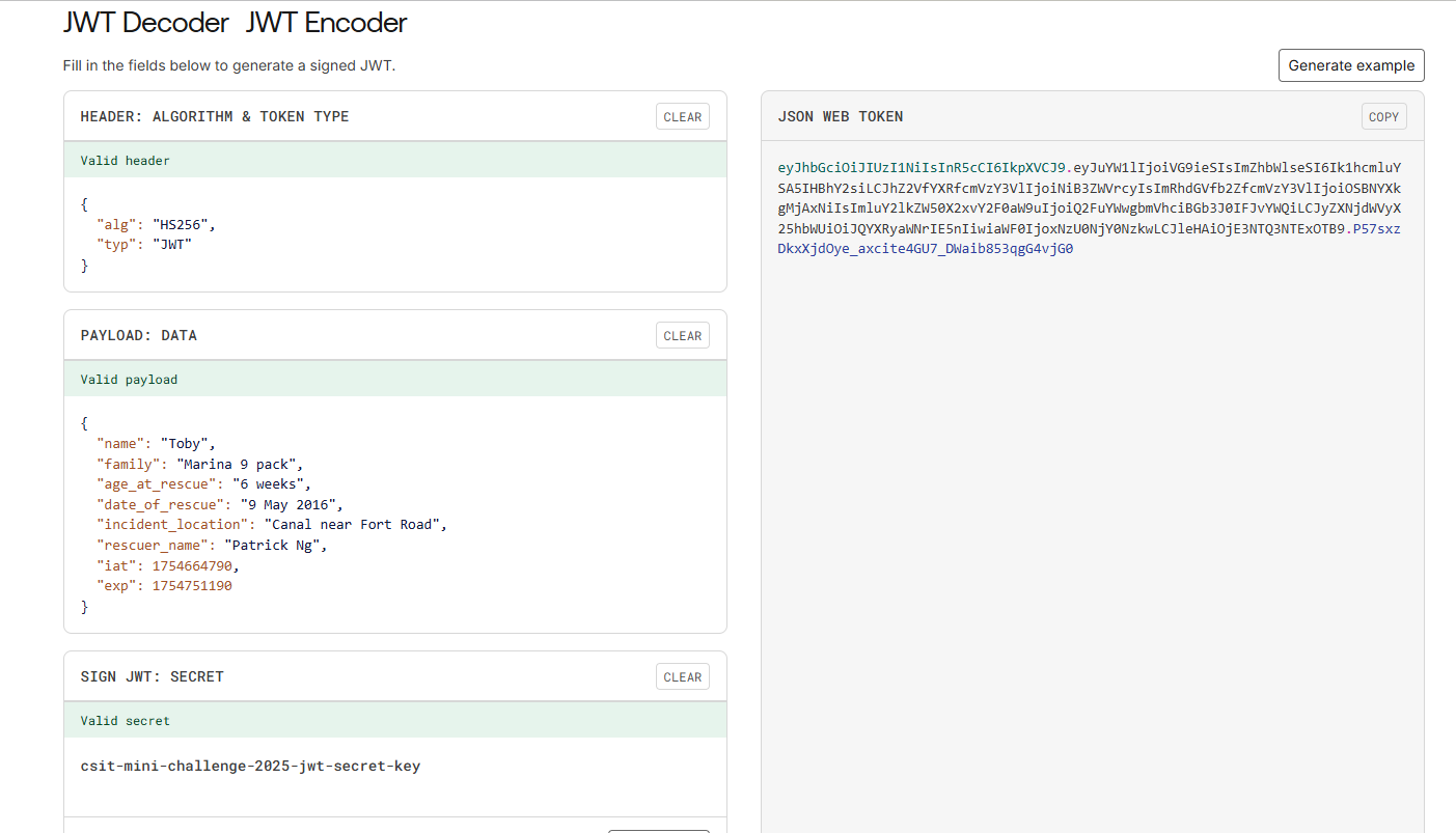 After you've identified the correct information, populate the JSON and throw it back into jwt.io. Remember to include the secret key.