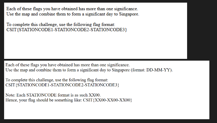 Scanning the QR code takes to you a hint page that tells you how to submit the final flag based on the previous 3 challenge findings. There were two versions of this hint page, one was in the first week of Aug, and the other captured around 18 Aug. I presumed that too many people has issues with the formatting of the final flag which is why they included the 0s and the DDMMYY format.