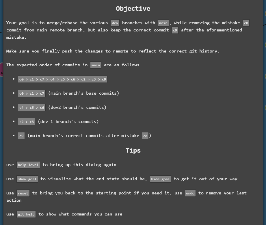 The first challenge is a devops-ish challenge that requires you to fix, merge, reorder, delete certain commits from certain branches.