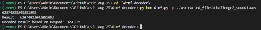 Upon unzipping, there are two WAV files and one README file to tell you how to join the two flags to submit. The first WAV file sounds like the tone when you key numbers in your phone. This tone is called DTMF which stands for Dual-Tone Multi-Frequency, is a signaling system used in telecommunications where each digit on a telephone keypad is represented by a unique combination of two audio tones.